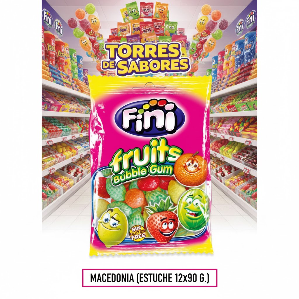 Bolsita Fini 90gr Macedonia, variedad de chicles con formas y sabores de frutas, este producto no lleva gluten, va presentado en una caja con 12 bolsitas. Son ideales para vending. Perfectas para llevarlas a cualquier parte.
