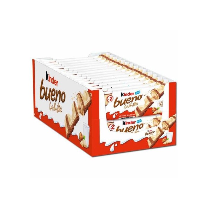 Las barritas Kinder Bueno White son deliciosas chocolatinas muy ligeras recubiertas con chocolate blanco suave y crema de avellana. Son unas de las barritas más dulces y ricas del mercado de las chocolatinas.