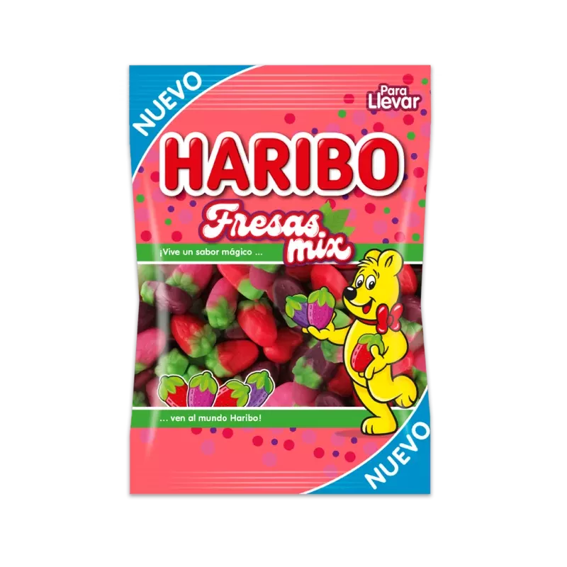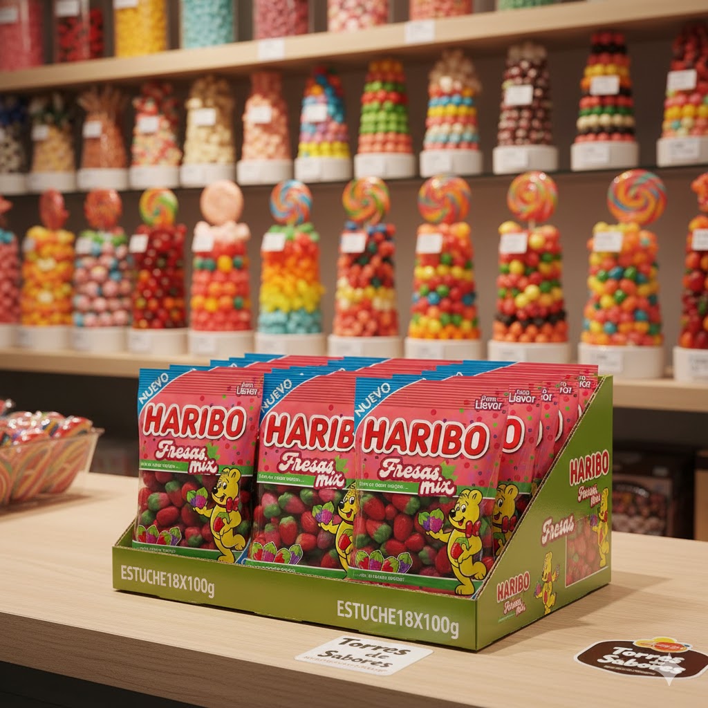 Surtido de caramelos de goma con forma de pequeñas fresas y de tres sabores distintos: sabor fresón, sabor fresa ácida, sabor mermelada de fresa. El tamaño perfecto para picotear. Se presenta en estuche con 18 bolsas de 100g.
