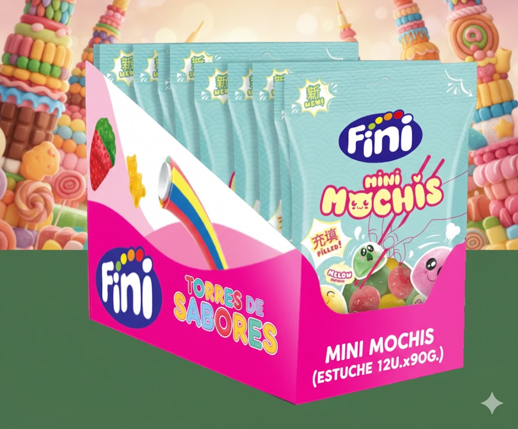 Caja de 12 bolsitas de 90 gramos de los nuevos Mini Mochis de Fini. Bolitas tiernas de golosina rellenas de jugosa gelatina con tres sabores diferentes: fresa, mango y melón. Perfectos para picar, decorar mesas de chuches o probarlas con tus amigos.