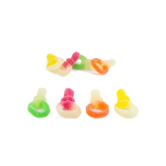 Golosina en forma de divertidos chupetes, cubiertos de azúcar y de colores surtidos. Están presentado en un bolsa con 250 unidades.