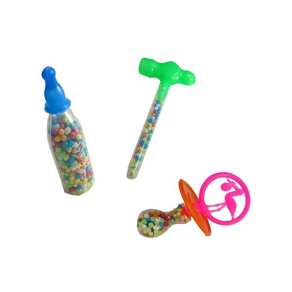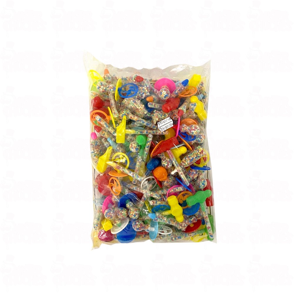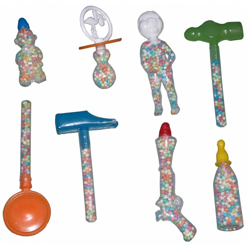 Figuritas de plástico surtidas llenas de anisitos, mini bolitas de caramelos de colores de anís. Bolsa de 100uds.