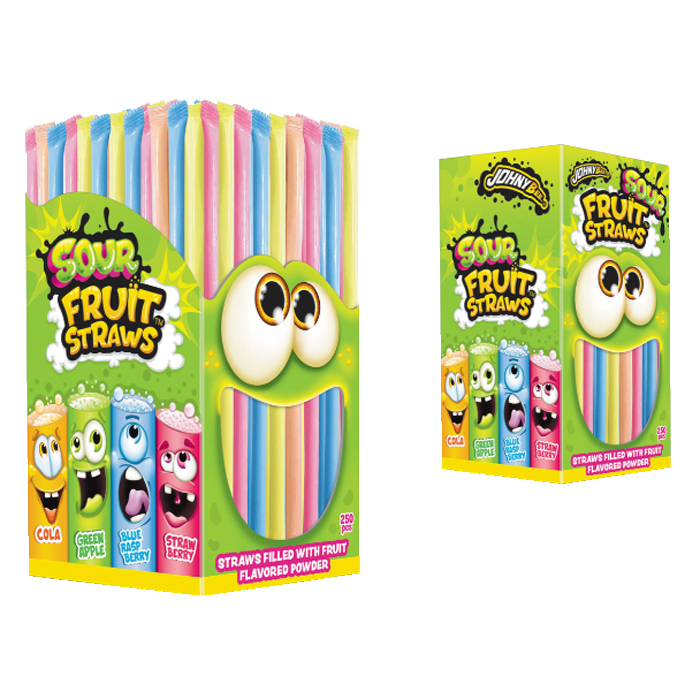 Pajitas pica pica surtidas, con cuatro colores y sabores distintos: fresa, manzana ácida, frambuesa y cola. Caja con 250uds.