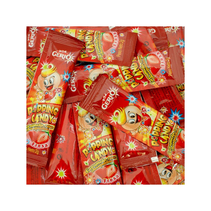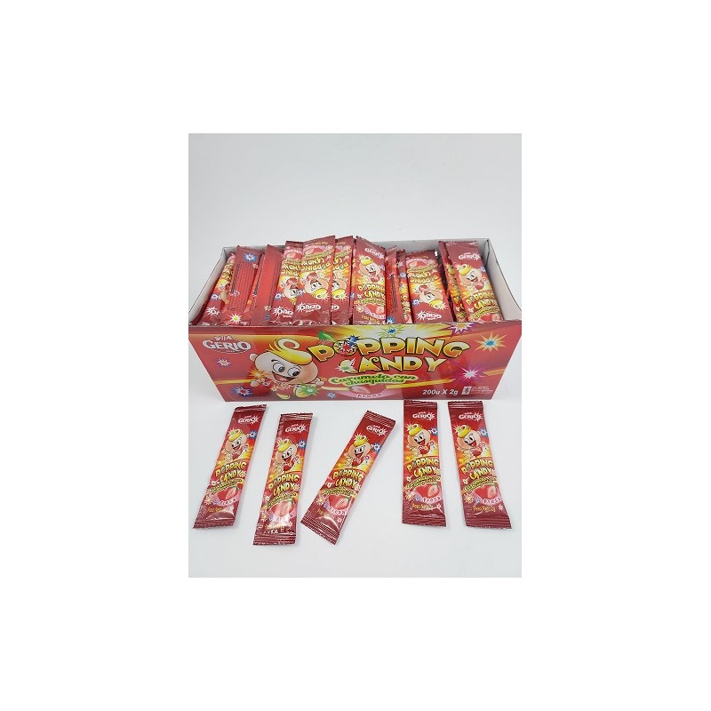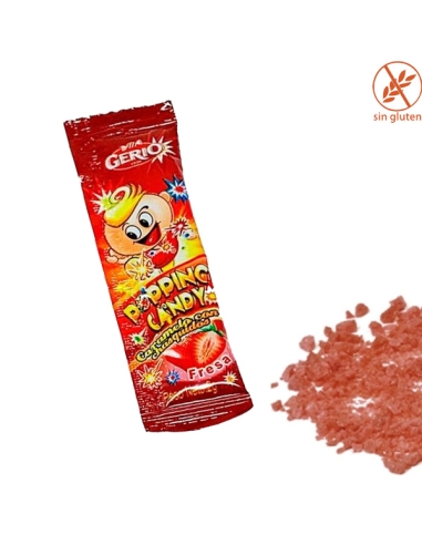 Son sobres de caramelos con chasquidos, con sabor a fresa ácida de color rojo. Sin gluten. Caja de 200uds.