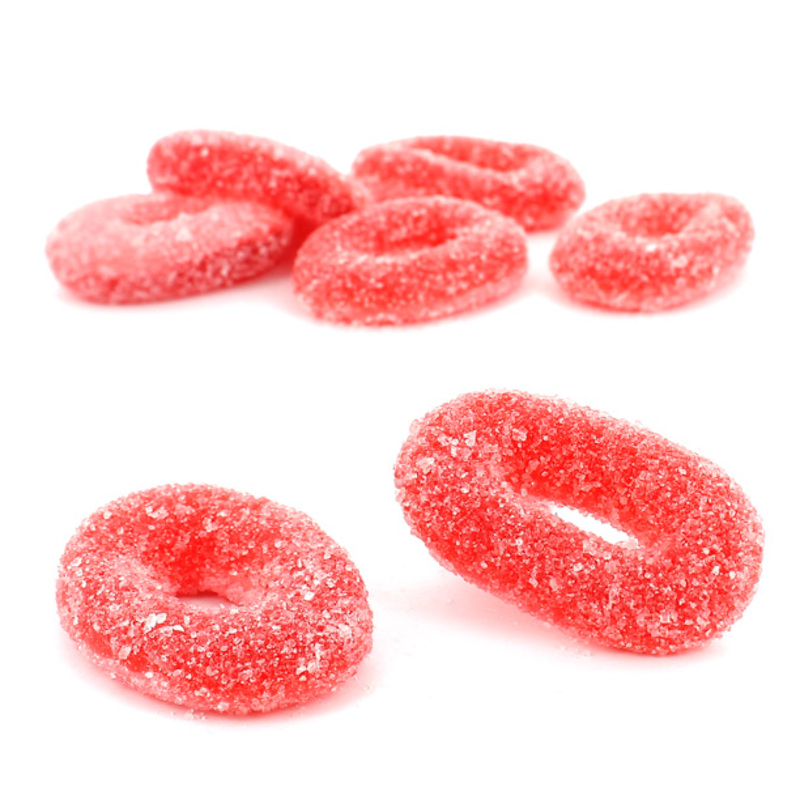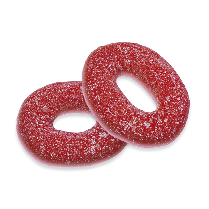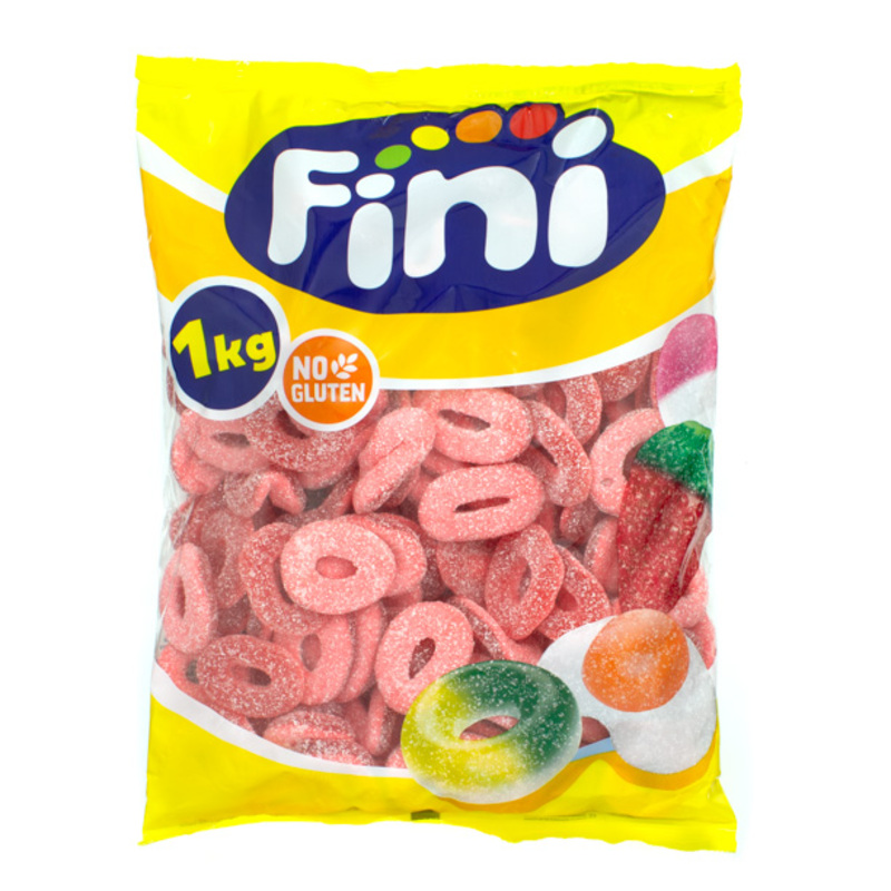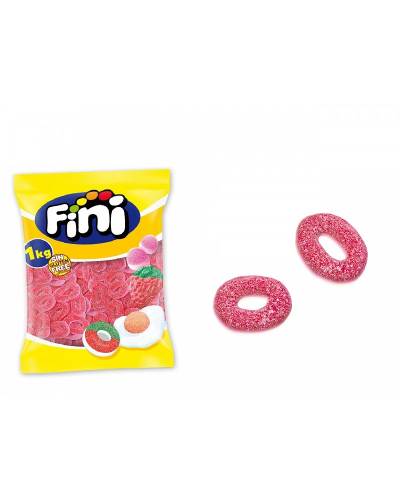 Bolsa de 1 kg de aros Fini de color rojo y recubierto de una fina capa de pica. Su sabor es ácido y duradero y su interior muy esponjoso.