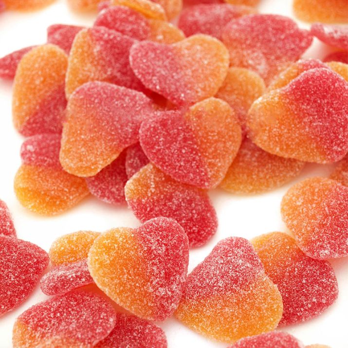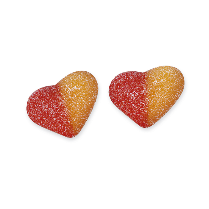 CORAZON MELOCOTON de Fini son golosinas en forma de corazones con sabor a melocotón y Fresa . Se venden en bolsa de 1kg. (140 aproximadamente) Sin Gluten. Estas chucherías son ideales para endulzar tus fiestas de cumpleaños, crear tus pasteles más divertidos o para realizar los conocidos Candy Bar.
