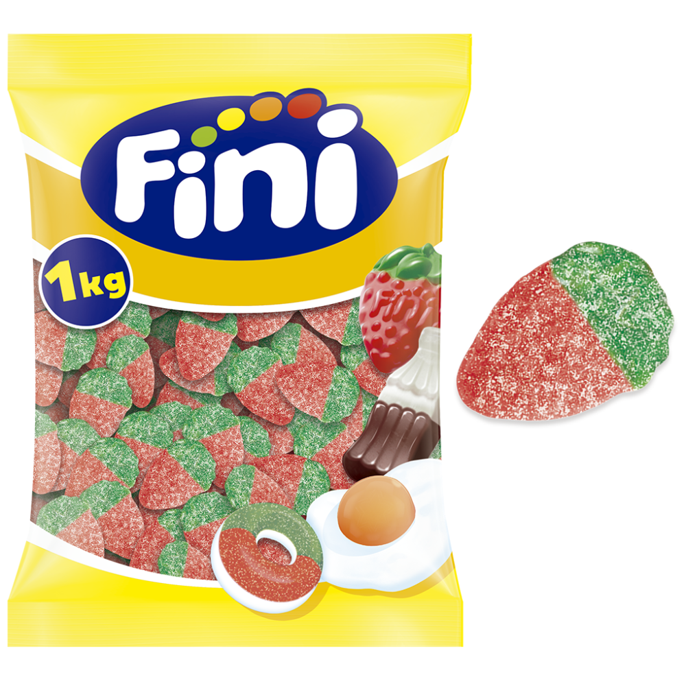 Deliciosas gominolas en forma de fresa de color verde y rosa, con un sabor intenso a fresa y ese punto de ácido que tanto gusta.