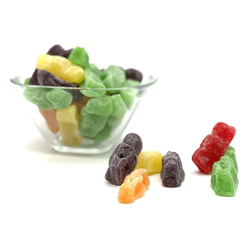 Caramelos de goma con llamativos colores. Esta golosina tiene un cuerpo de gelatina y una cobertura con azúcar glas con sabores surtidos a: fresa, naranja, limón y grosella.