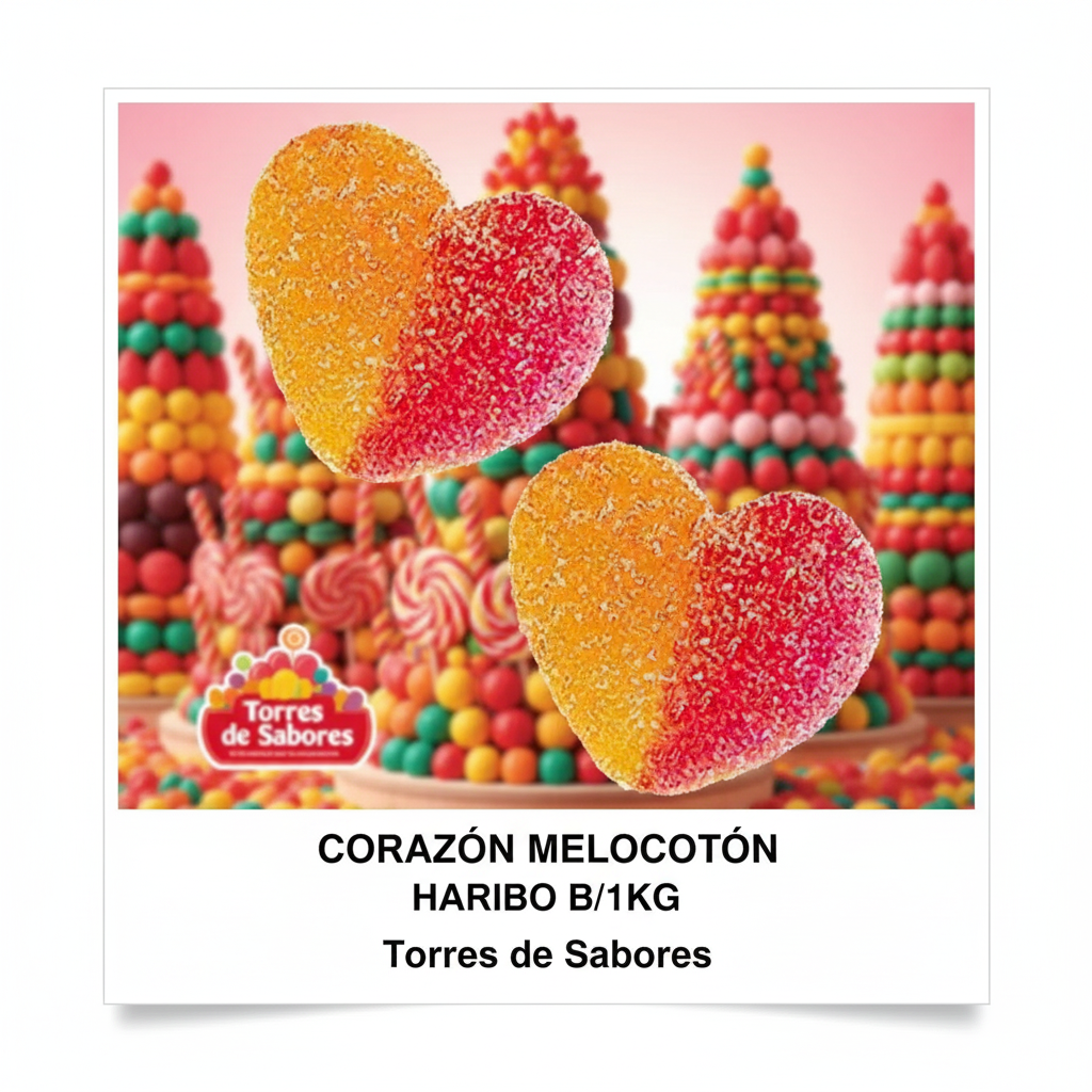 Corazón melocotón Haribo, tiernas gominolas con forma de corazón y un delicioso sabor a melocotón. Su textura suave y su irresistible toque dulce las hacen ideales para compartir en celebraciones, como detalle en mesas dulces o para disfrutar en cualquier momento especial. Presentadas en un formato práctico de 1 kg.
