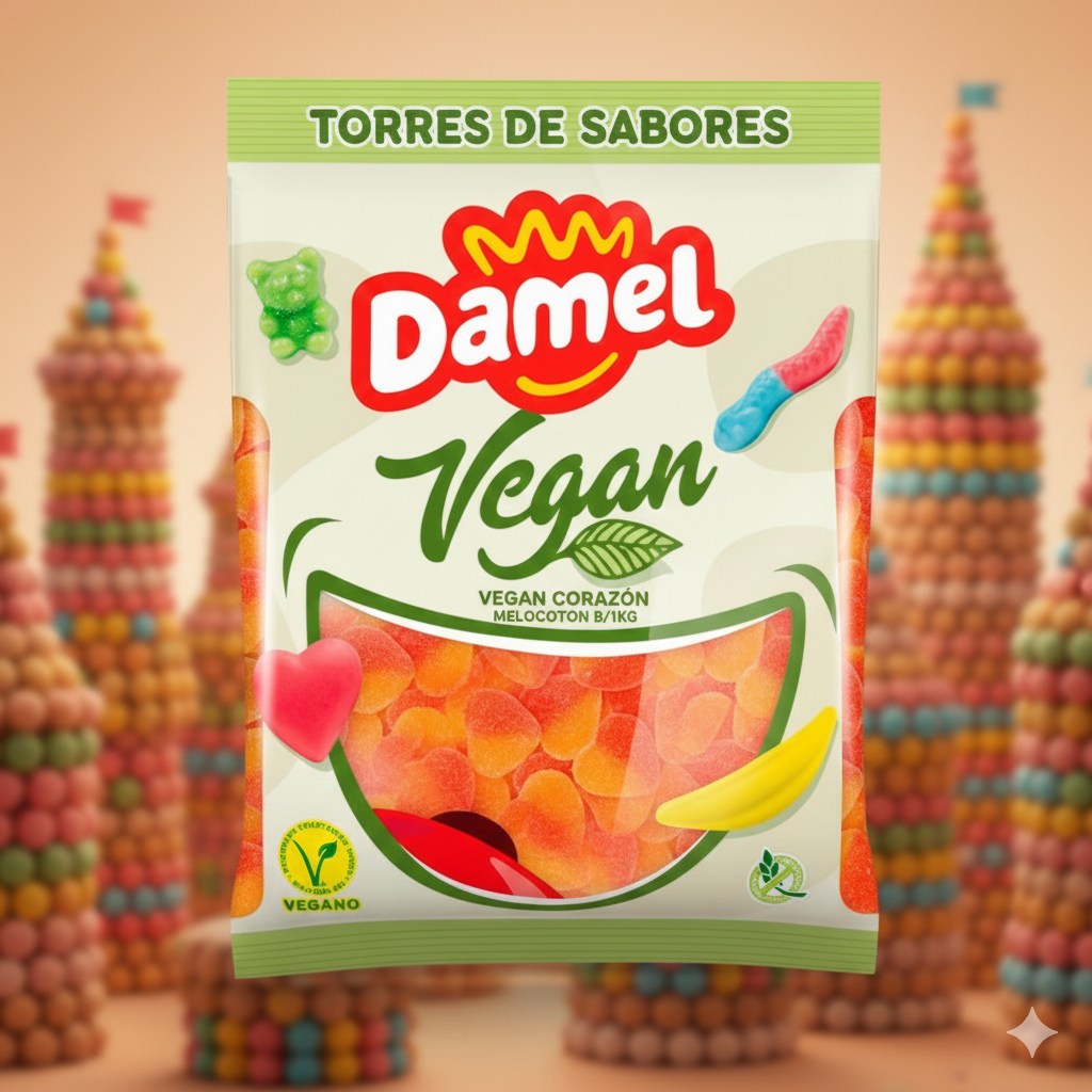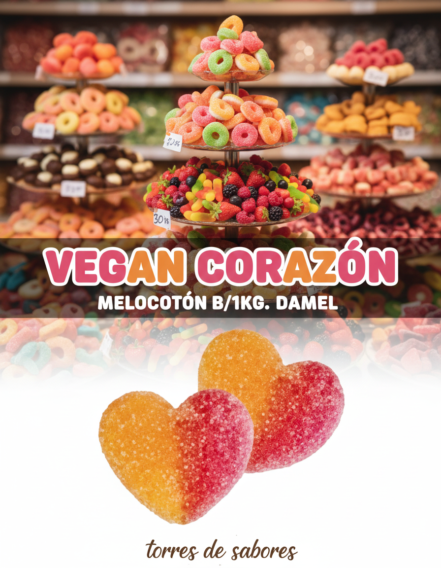 CORAZONES MELOCOTÓN VEGANOS 1kg DAMEL son caramelos de goma de gelatina vegetal con forma de corazón con todo el sabor del melocotón. Se venden en bolsas de 1Kg. Sin gluten.