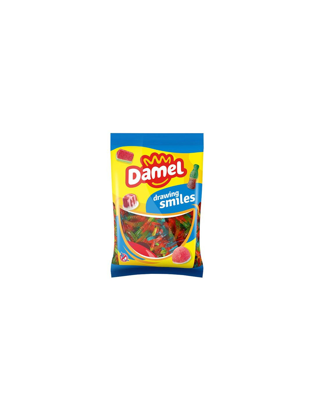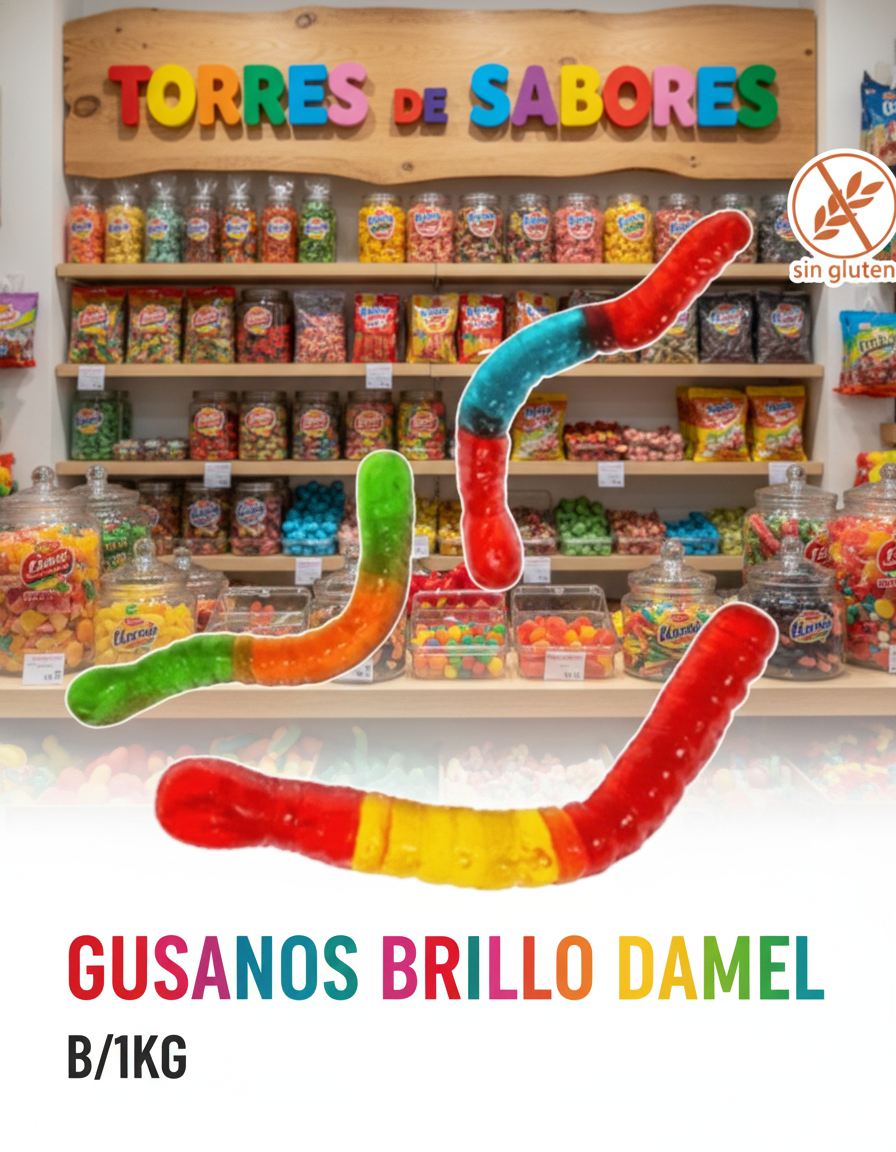 Los gusanos de Damel son una goma de brillo y surtido con forma divertida. Se venden en bolsas de 1 kilo. Sin gluten.
