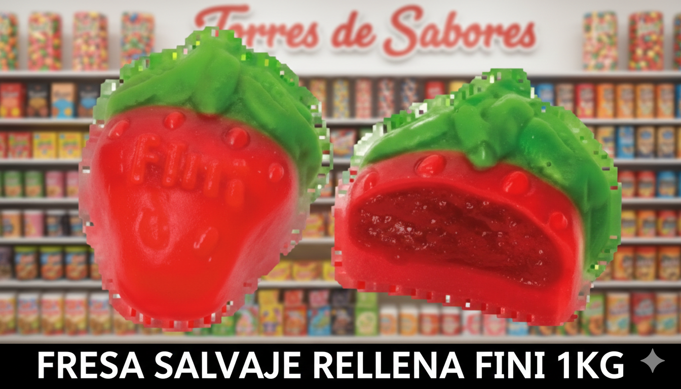 Bolsa de 1 kilo de golosinas de Fresas Salvajes Fini rellenas de gelatina y con un sabor a fresa intenso. Ideales para llenar tarros o añadir un toque frutal a cualquier rincón dulce. Sin gluten.