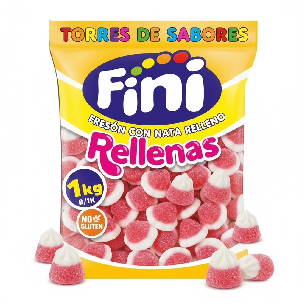 Bolsa de 1 kilo de golosinas Fresón con Nata Fini, rellenas de gelatina con sabor a fresa y nata. Perfectas para completar surtidos, llenar tarros o sorprender con un toque diferente. Sin gluten.