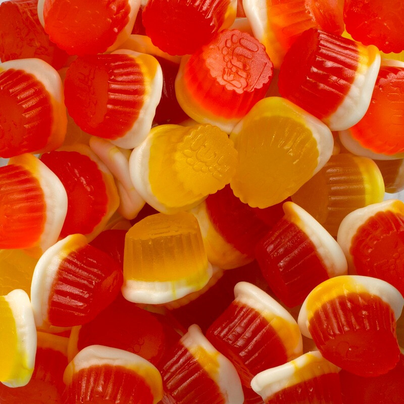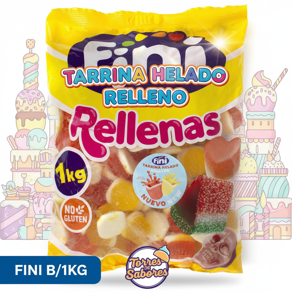 Rellenas tarrinas heladas fini 1 kg. Deliciosas gominolas rellenas de gelatina con forma de tarrina. Sabor naranja y limón. Producto sin gluten. Bolsa 1 kg .