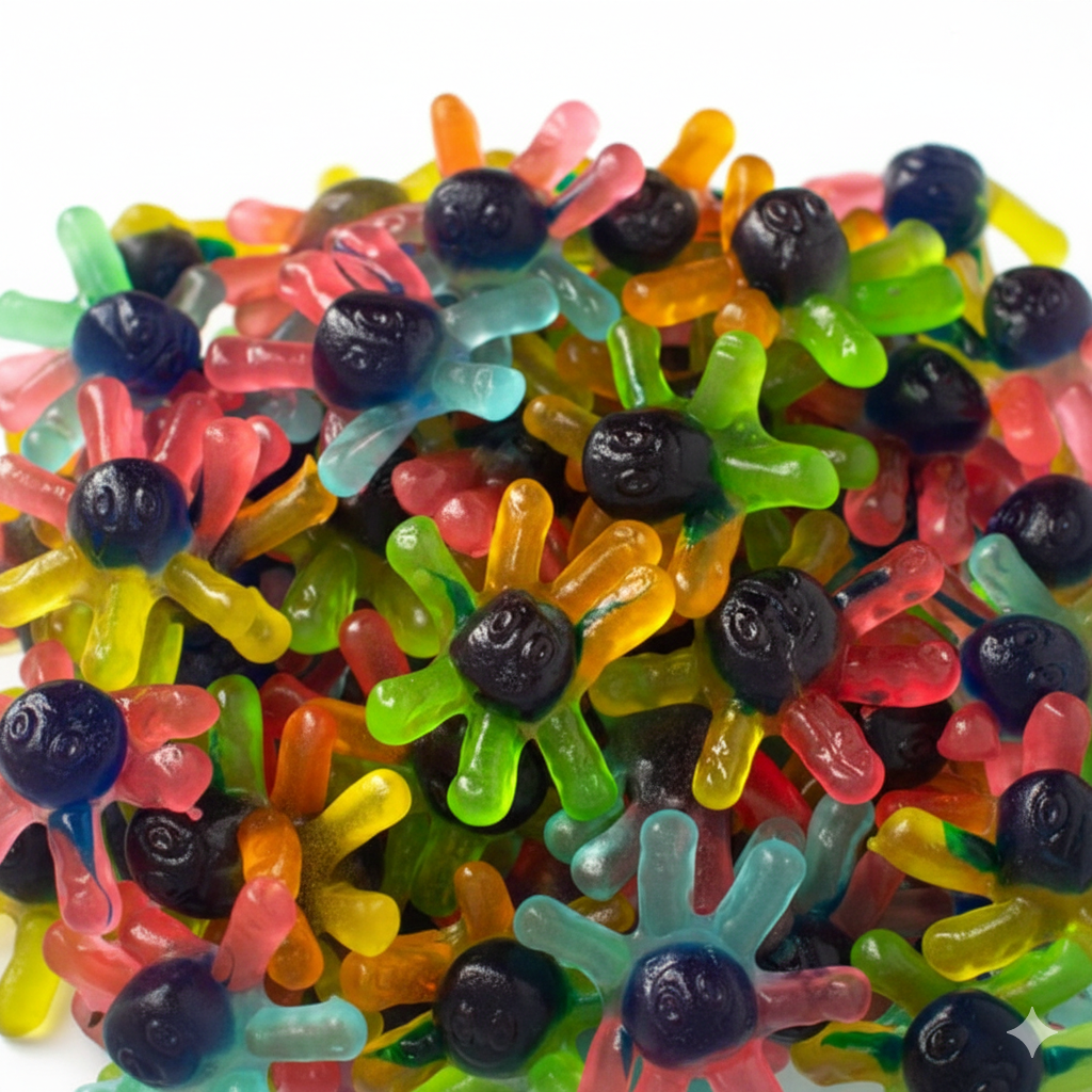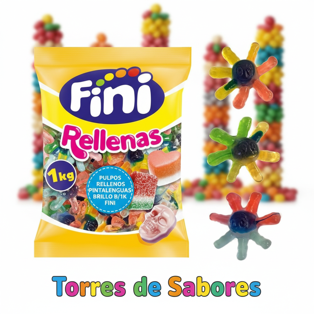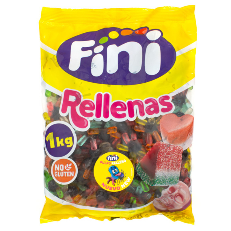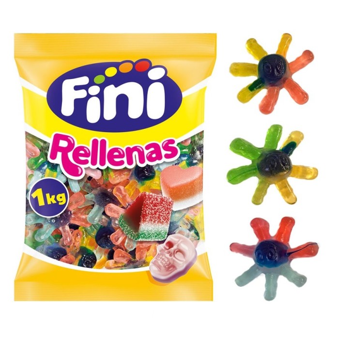 Caramelos de goma rellenos. Con forma de divertidos pulpos, multifruit y rellenas de gelatina. Además son pintalenguas. Pertenecen a la línea de golosinas rellenas de Fini. Es un producto SIN GLUTEN.