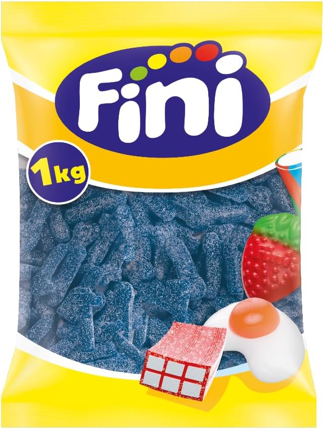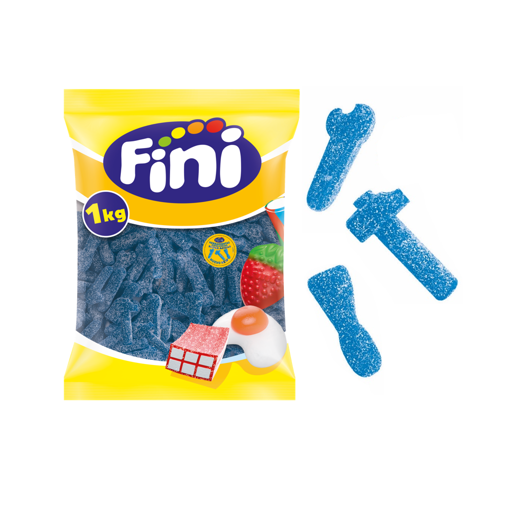 Caramelos de goma de Fini. Golosinas deliciosas y super ácidas golosinas. Con forma de llaves inglesas, martillos y espátulas. Son de color azul, con sabor a frambuesa. Además, son pintalenguas, doble de diversión. Presentadas en una bolsa con 1kg. Producto sin gluten.