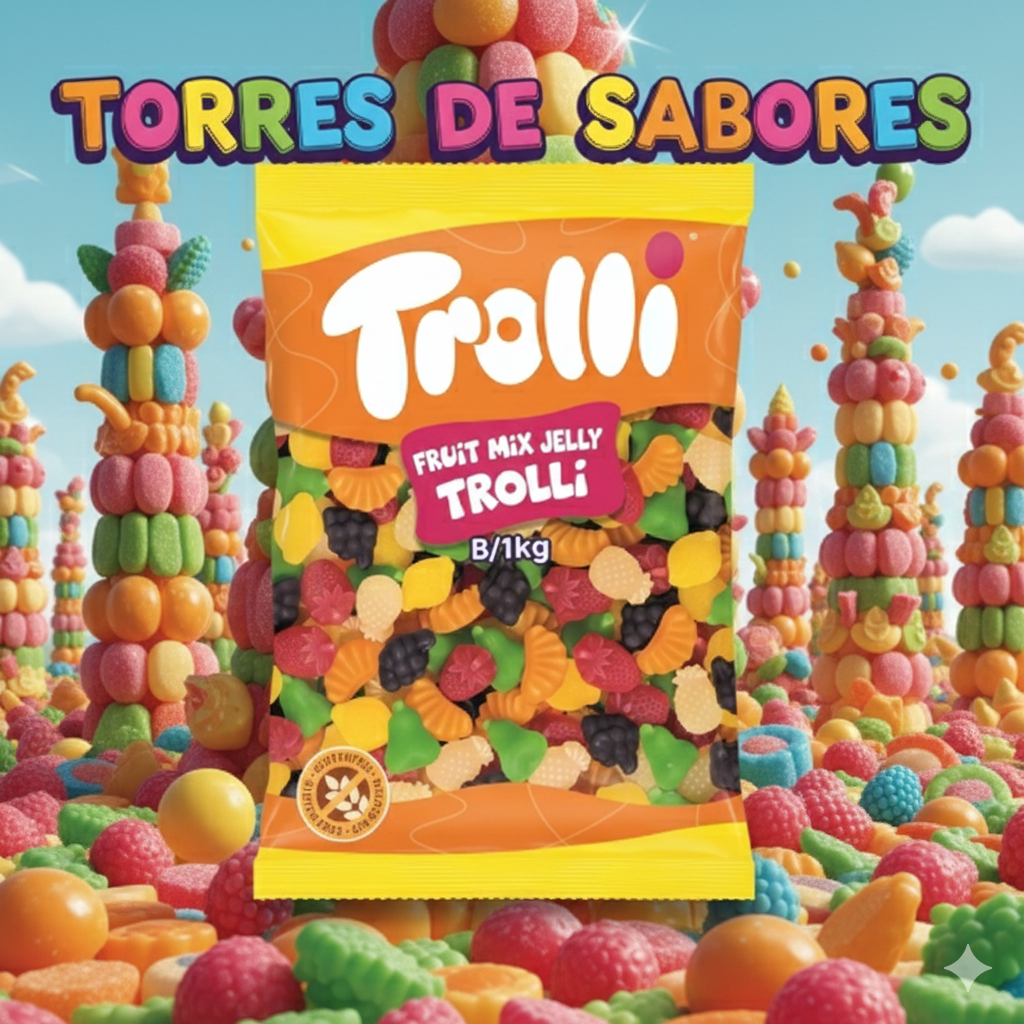 Bolsa de caramelos de goma con zumo de frutas sin gluten que están deliciosos. Se presenta en bolsa de 1 kg.