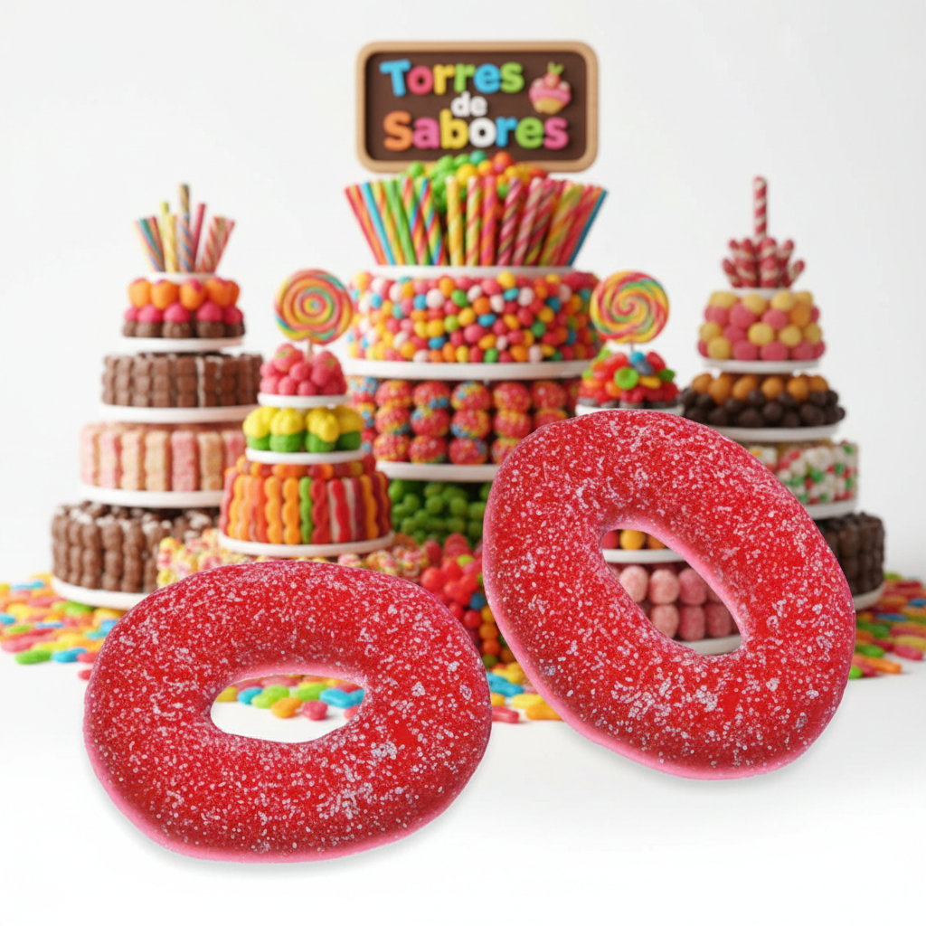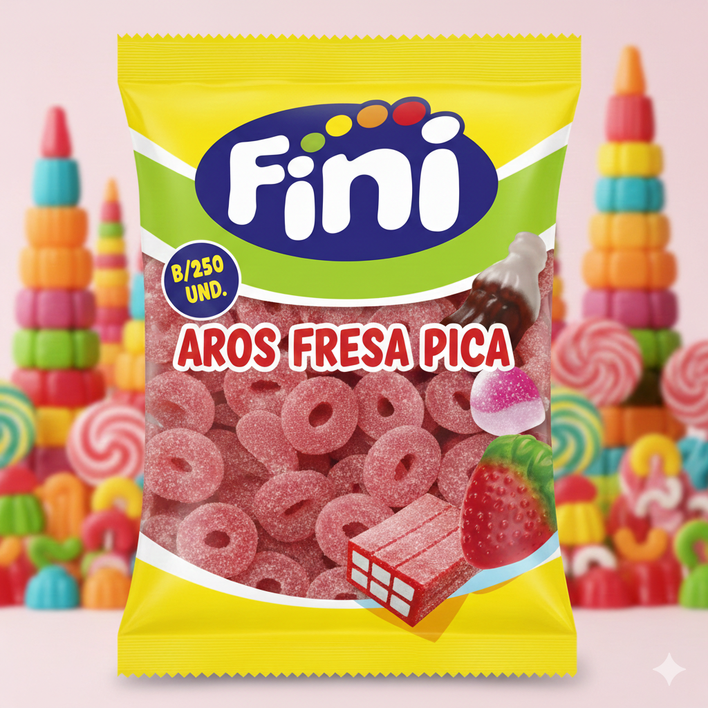 Caramelos de goma Fini, aros fresa recubiertos de pica, su sabor es ácido y duradero y la textura de pica, aunque es muy esponjosa en su interior. Sin gluten. Bolsa de 250 unidades.
