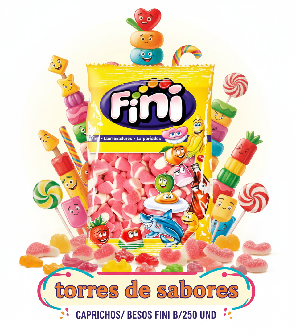Caramelos de goma Fini Besos o Caprichos. Con una textura suave y cremosa. Con un inconfundible sabor a fresa y nata.