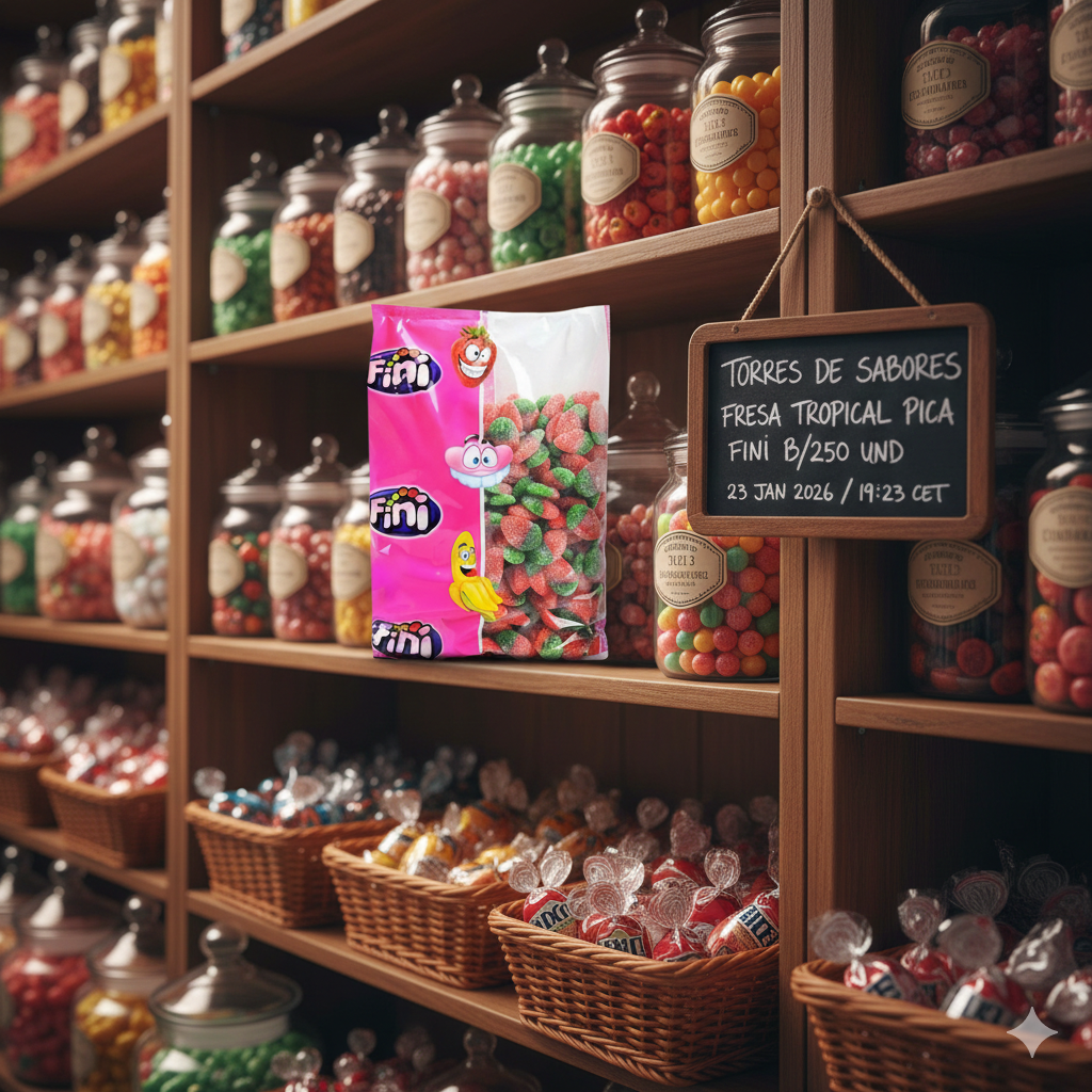 FRESAS SALVAJES PICA 250uds de Fini son las clásicas fresas de goma envueltas de picas. Se venden en bolsas de 250uds. Sin gluten.