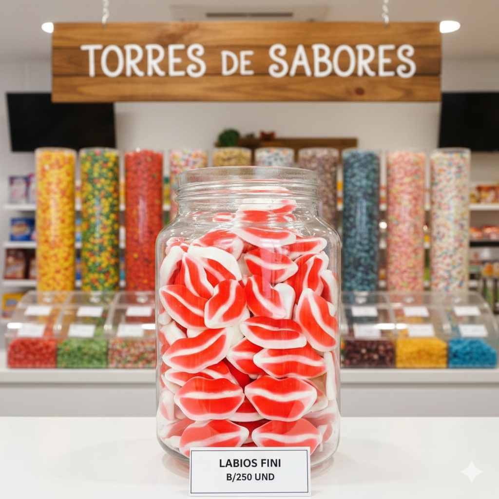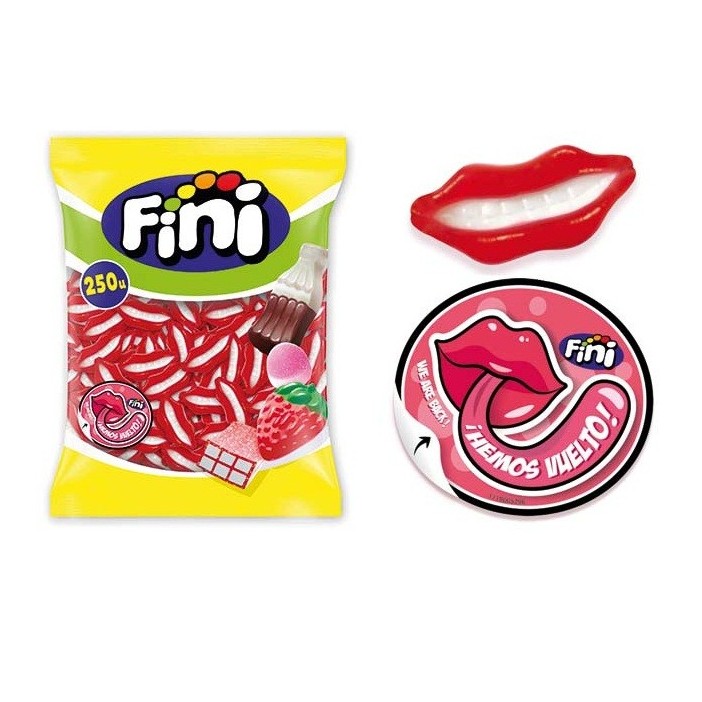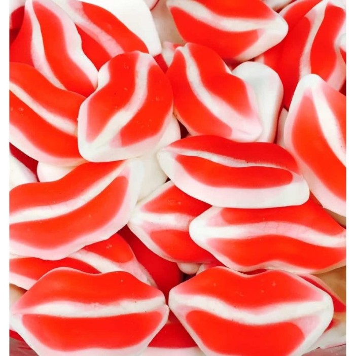 Divertidos caramelos de goma con forma de labios y un delicioso sabor a fresa y nata. Se presenta en bolsas de 250 unidades. Los labios son de color rojo y blanco. Es un producto sin gluten.