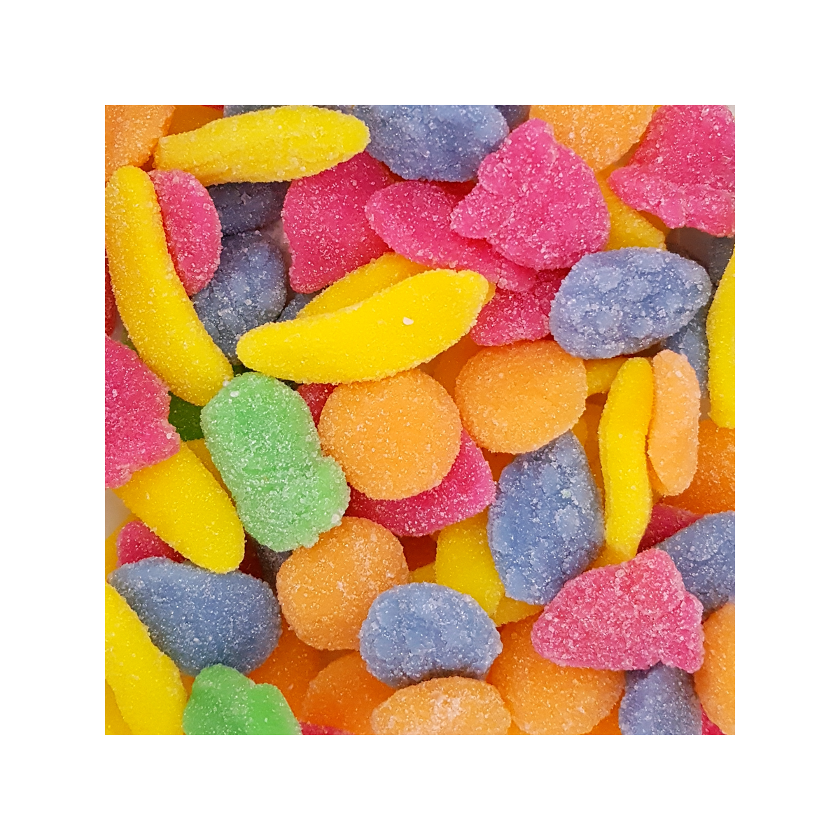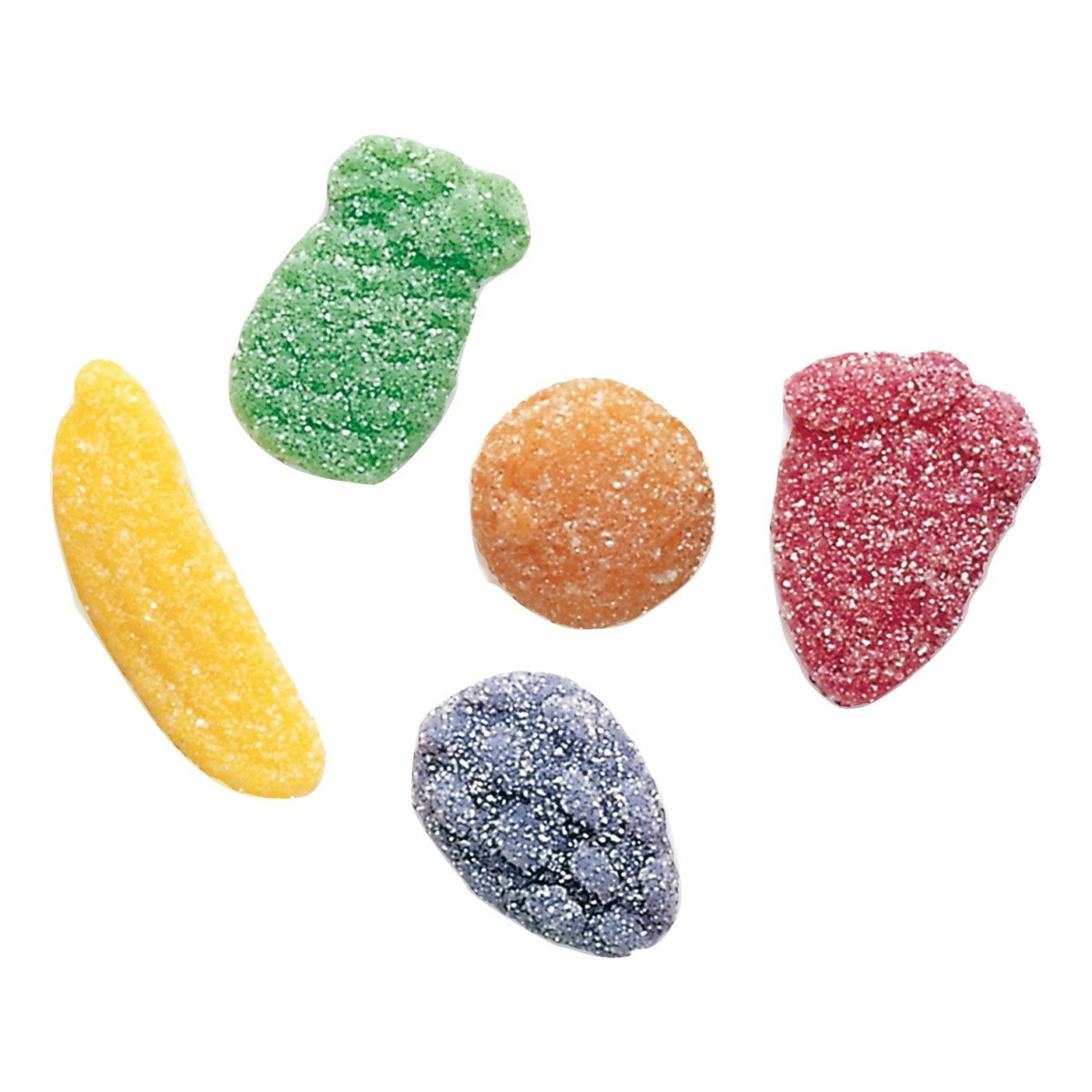 Caramelo de goma con forma de frutas y cubiertas de pica. Bolsa de 250 unidades.