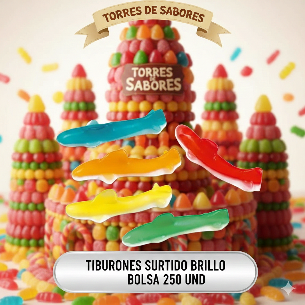 Los Tiburones Brillo de Fini son gomas brillo de colores con forma de tiburón que se venden en bolsas de 1kg. Sin Gluten Estas chucherias son ideales para endulzar tus fiestas de cumpleaños, crear tus pasteles más divertidos o para realizar los conocidos Candy Bar.