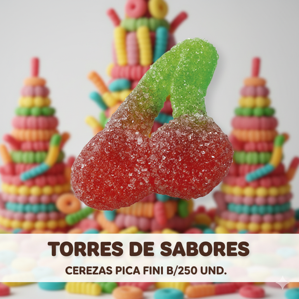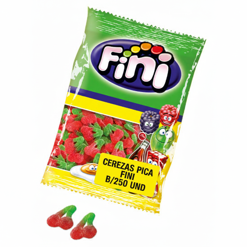 Las Cerezas Pica de Fini son gominolas con forma de cereza y un toque ácido irresistible. Su colorido, textura blanda y sabor afrutado las hacen perfectas para fiestas, candy bars o tiendas. Con 250 unidades por bolsa, son ideales para compartir o disfrutar en cualquier momento. Sin gluten.