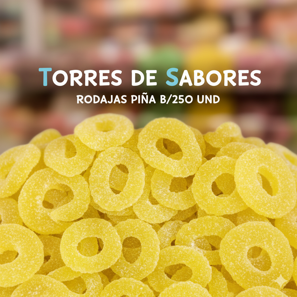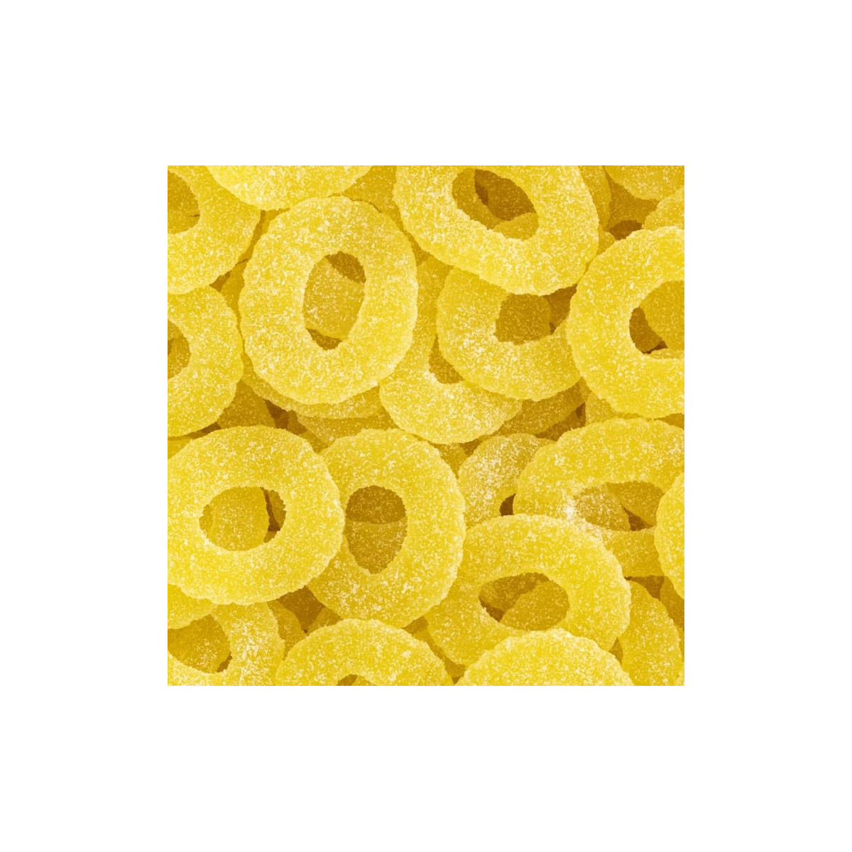 Golosina con forma y sabor de rodajas de piña, cubiertas de azúcar, transpórtate al paraíso tropical. Bolsa de 250 unidades. Sin gluten.