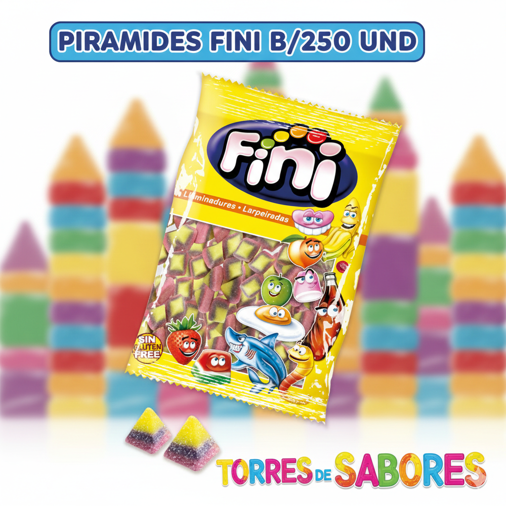 Las míticas pirámides de golosina. Hubo un tiempo en el que se desaparecieron del mercado y les perdimos la pista, pero Fini volvió a recuperarlas para que podamos disfrutar de todo su sabor. Vienen en bolsa de 250 chuches. Sin gluten.