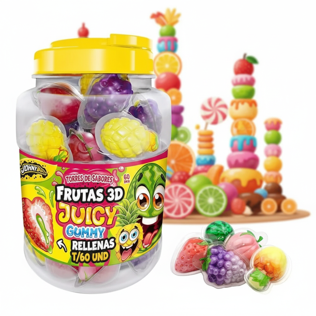 Cada caja contiene 60 Gominolas, con formas 3D de frutas y sabor a zumo de fruta. Producto sin gluten.