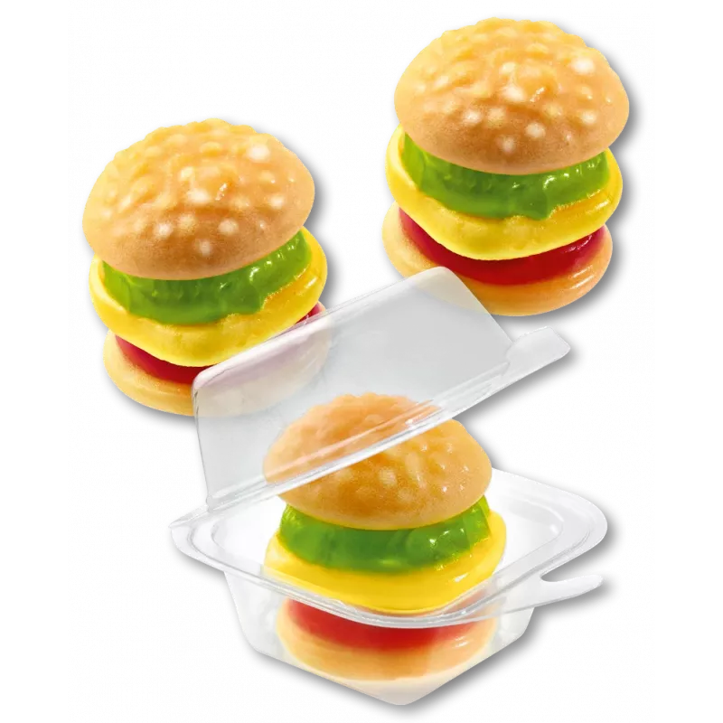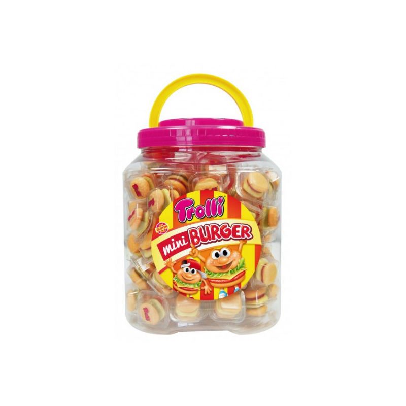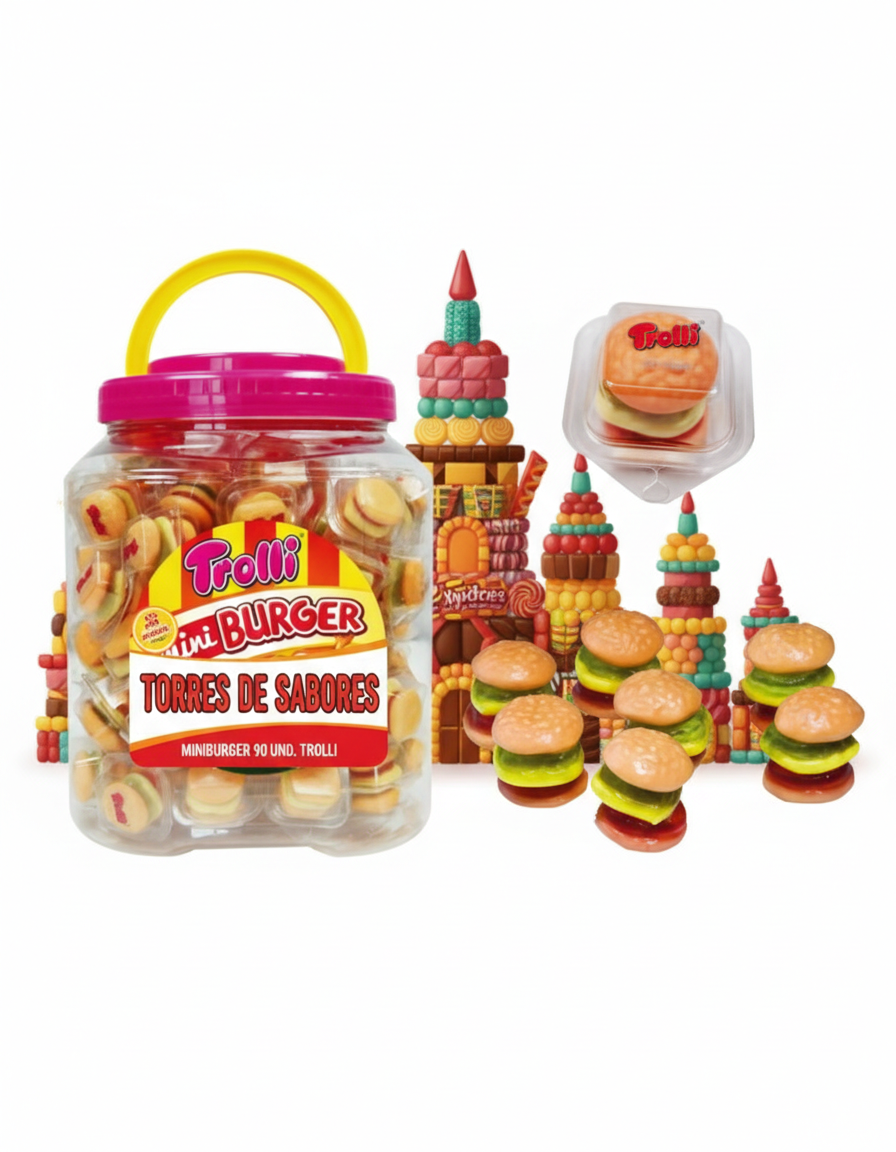 Las Mini Burguer de Trolli son gominolas con forma de hamburguesa, envueltas individualmente y presentadas en un bote de 90 unidades. Divertidas, sabrosas y muy visuales, son ideales para fiestas, celebraciones o para vender al detalle. ¡Un clásico que nunca falla!. Sin gluten.