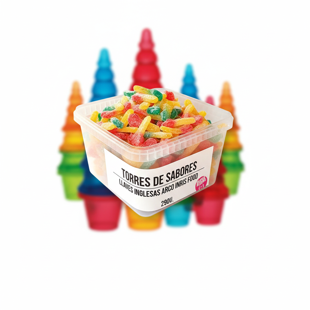 Gominola en forma de llave inglesa, con sabor a FRUTA VARIADAS...todo un disfrute, para los amante de lo ácido...tiene que probar esta llaves inglesas.Tarro de 290 unidades.