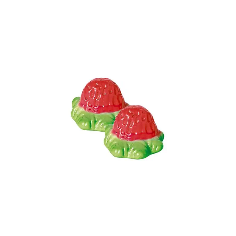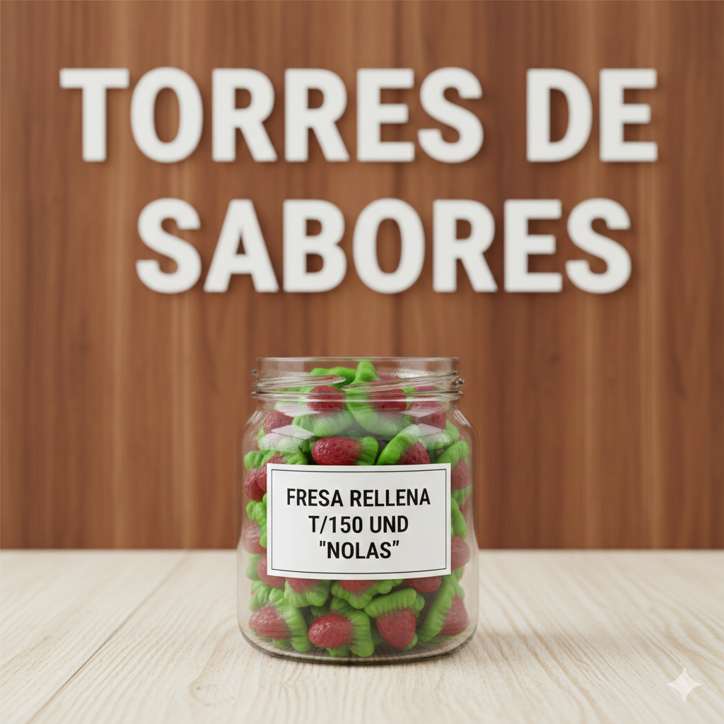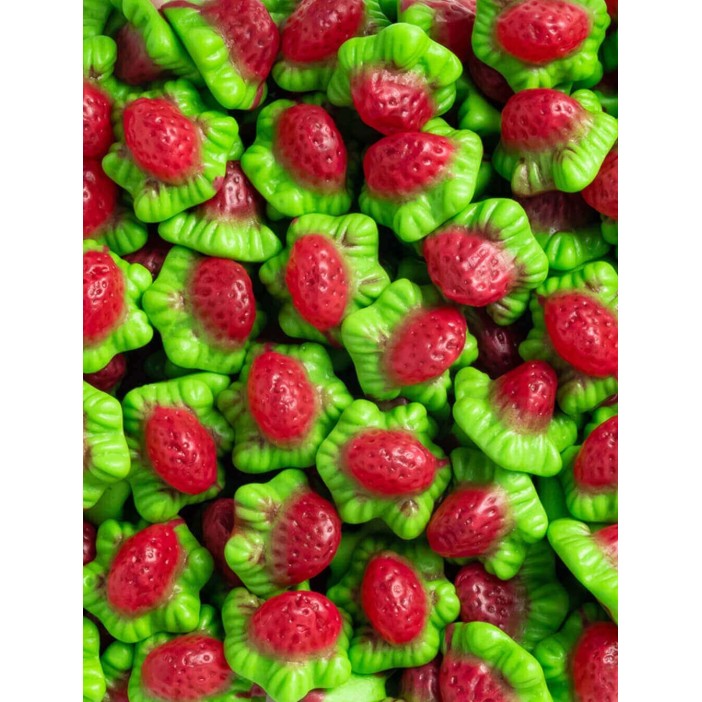 Golosinas rellenas con forma de fresas. Con un intenso e inconfundible sabor a fresa. Están presentados en un tarro con 150 unidades. Es un producto SIN GLUTEN.