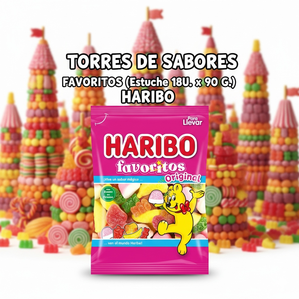 Surtido de golosinas Haribo Favoritos Original, caramelos de goma con distintas texturas y sabores, y recubiertos de azúcar. Golosinas tan clásicas de la marca como ositos, melocotones, plátanos, besitos y fresas. En un formato perfecto para llevar a cualquier parte o para vending.