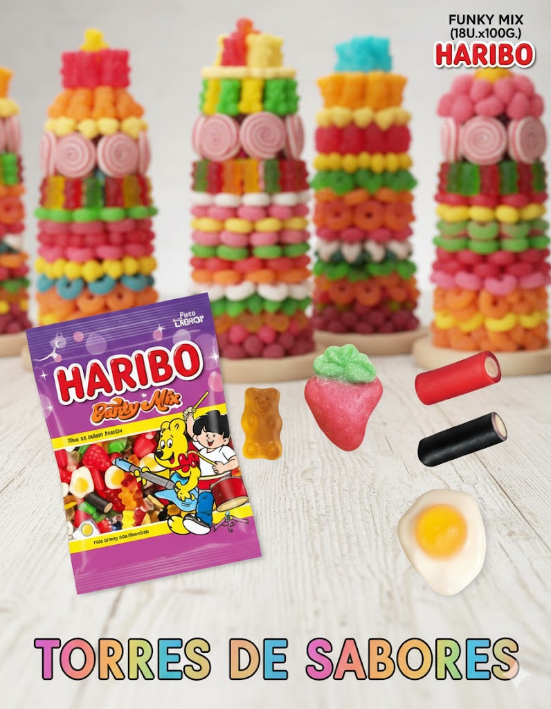 Surtido de golosinas y regaliz Haribo Funky Mix. Con distintos sabores y texturas encontrarás ositos de oro, huevos fritos, balla-balla fresa, fresones y balla-balla dúo.