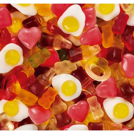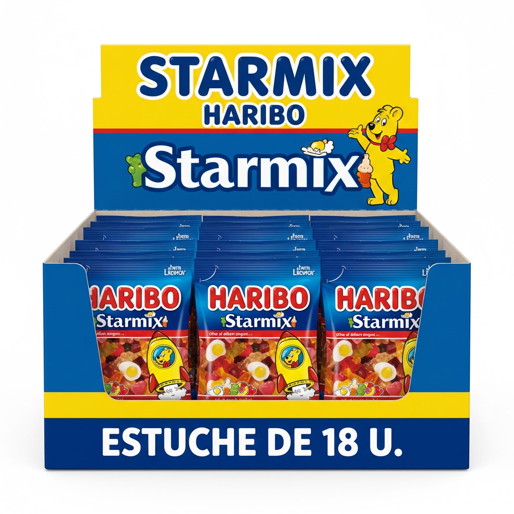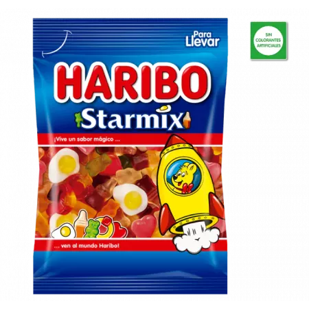 Surtido de golosinas Haribo Starmix. Caramelos de goma con distintas texturas y sabor frutas y cola, encontrarás en su formato brillo ositos, botellas cola, mini corazones, mini huevos o anillos.