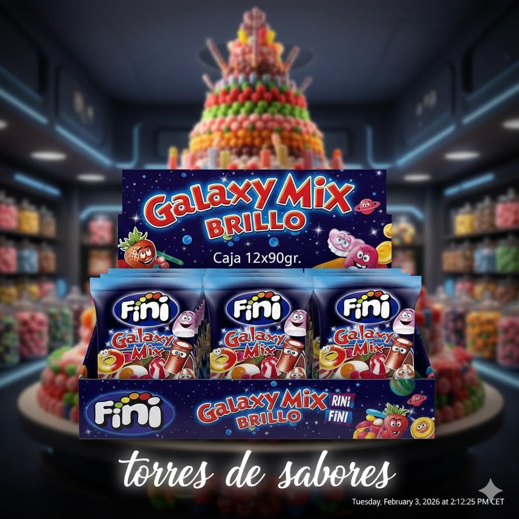Os traemos los galaxy mix brillo de Fini. Las chuches brillantes y elásticas de la galaxia. Esta caja contiene 12 bolsas de chuches para disfrutar con sabores variados y divertidas formas. Un mix lleno de color y dulzura que conquista desde el primer bocado. Ideal para compartir o disfrutar solo, es perfecto para quienes buscan variedad y calidad. Se presenta en bolsas de 90 gramos, comercializadas en cajas de 12 unidades.