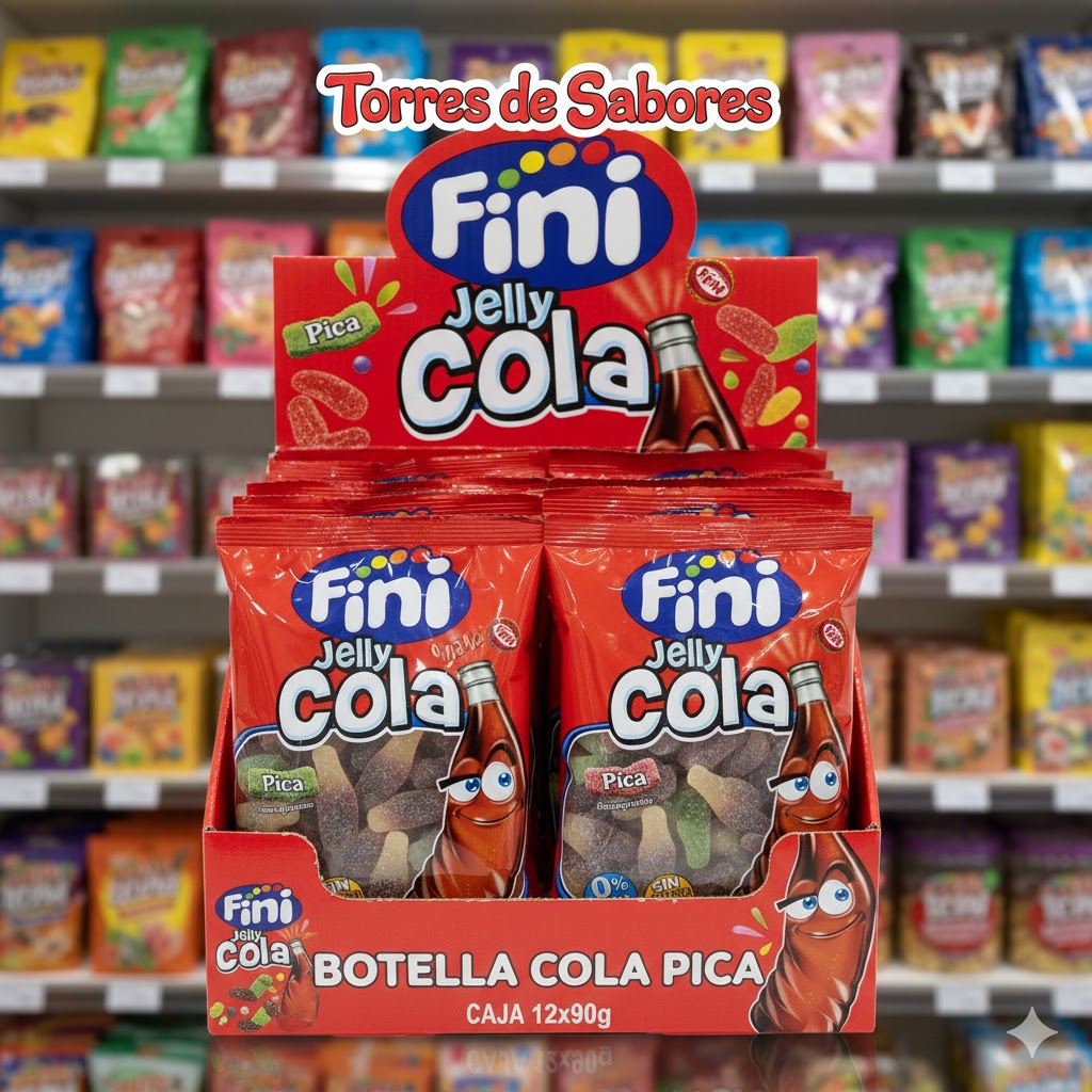 La caja contiene 12 bolsas de 90 gramos de botellas Jelly Cola.