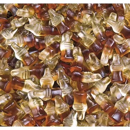Caramelos de goma con forma de botellas cola, con su textura característica y un intenso sabor a cola.
