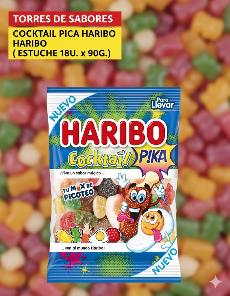 Surtido de gelatinas de tamaño pequeño y formas surtidas: huevos, ositos, botellas, frutas, etc., con sabores frutales y recubiertas de azúcar ácido. Cada paquete contiene 90 gramos. Caja con 18 paquetes.