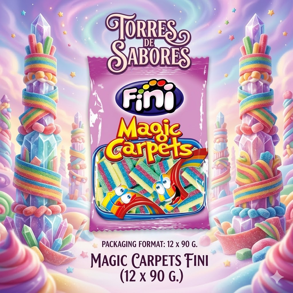Los Magic Carpets Fini son una delicia única de la reconocida marca Fini, que te hará vivir una experiencia dulce inolvidable. Con sus colores y sabores suaves, estas golosinas son simplemente irresistibles para ti. Caja de 12 unidades de 90 gramos.