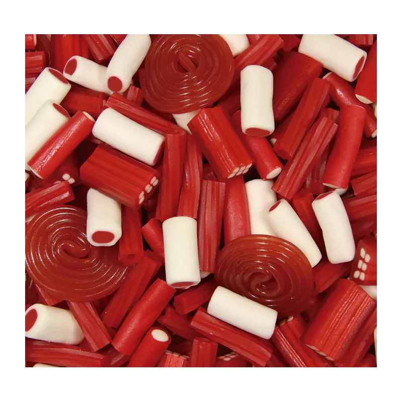 Surtido de tus geles dulces favoritos, con sabor a Fresa, discos de fresa, balla-balla red, balla-balla white, mega torcidas fresa y ladrillos fresa-nata