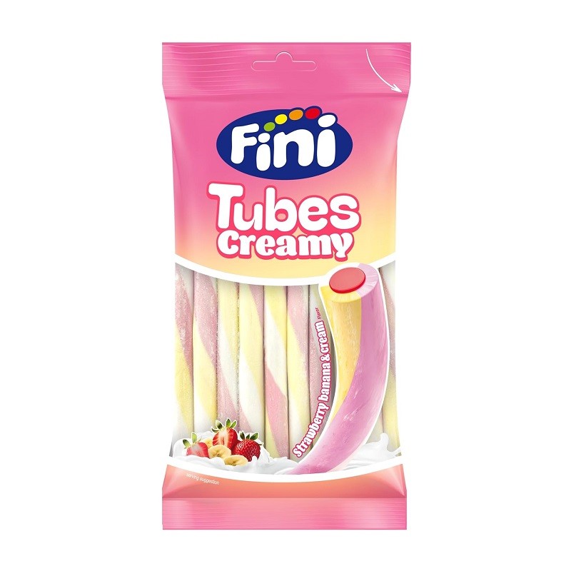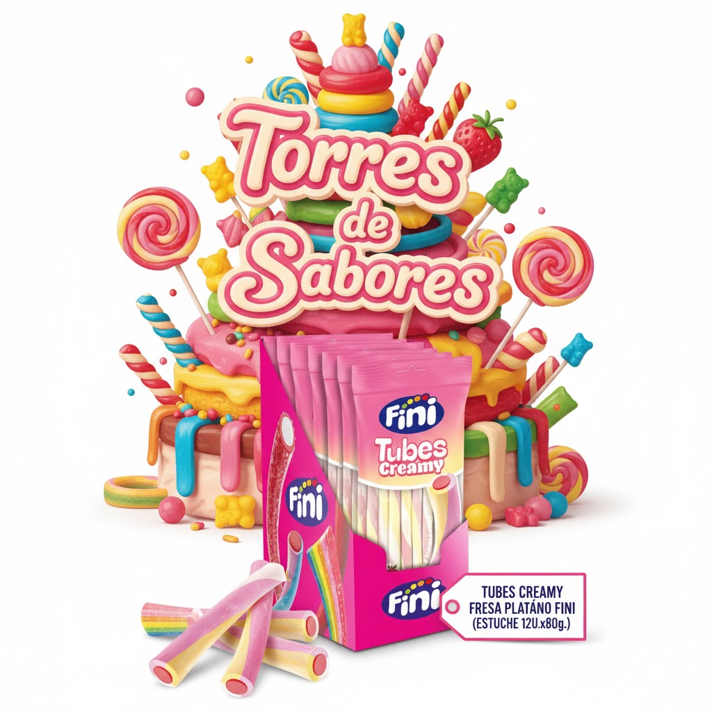 Caja de 12 bolsitas de 80 gramos de Tubes Fini Creamy Yogur Fresa y Plátano, deliciosos tubos de regaliz de yogur, fresa y plátano rellenos de gelatina de fresa. Perfectos para decorar mesas dulces, sorprender en fiestas o disfrutar en momentos con amigos.