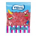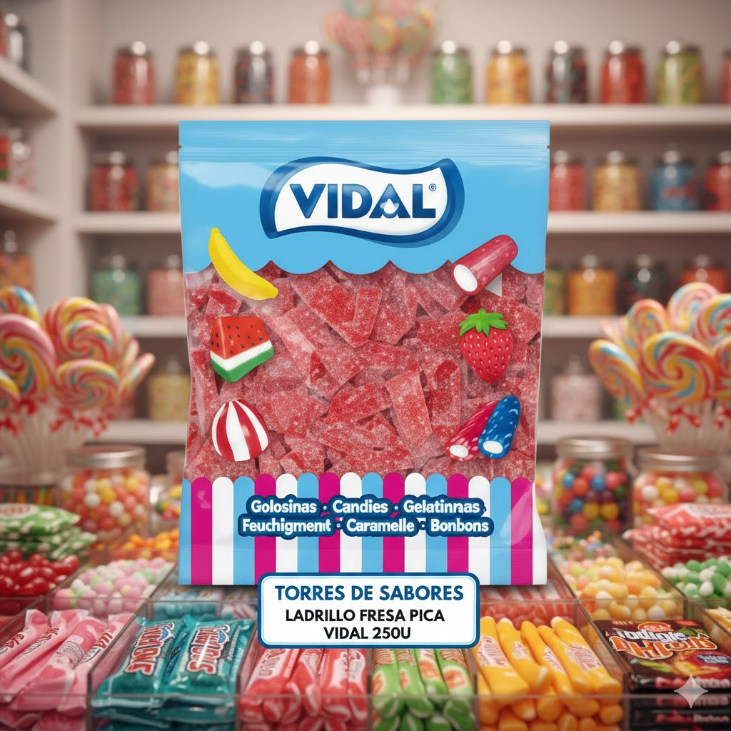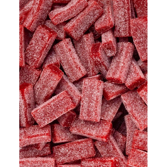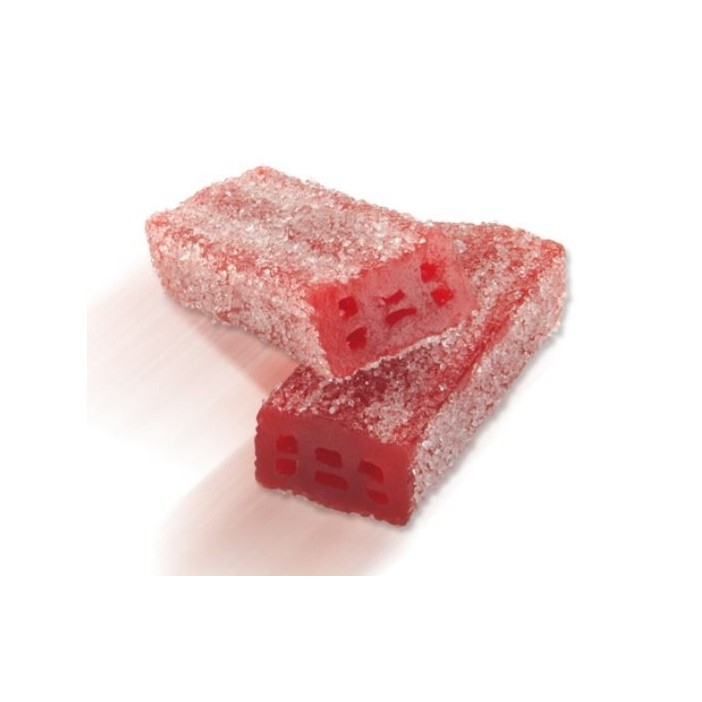 Regaliz clásica de golosina con forma de ladrillos, rojos, sin relleno y con una cobertura ácida. Presentada en una bolsa con 250 unidades.