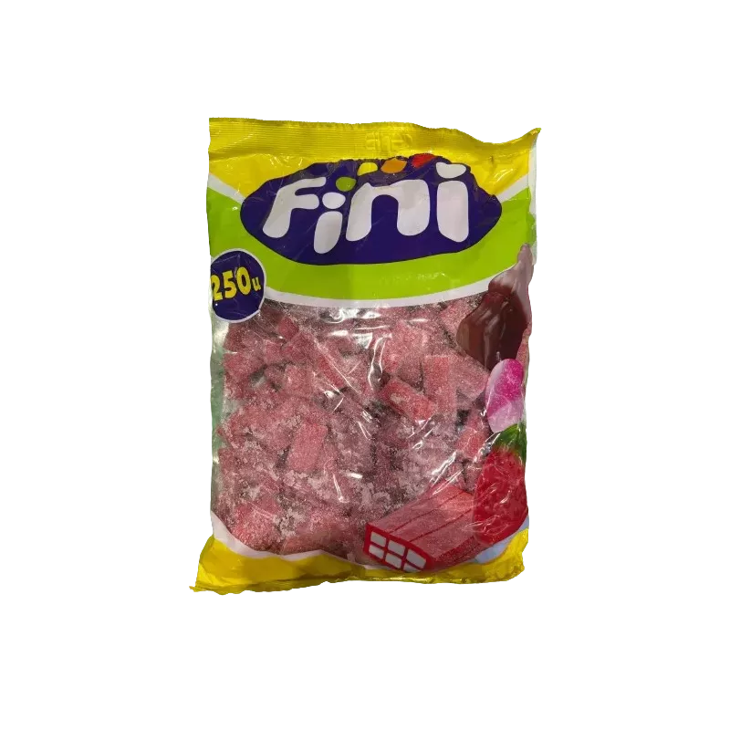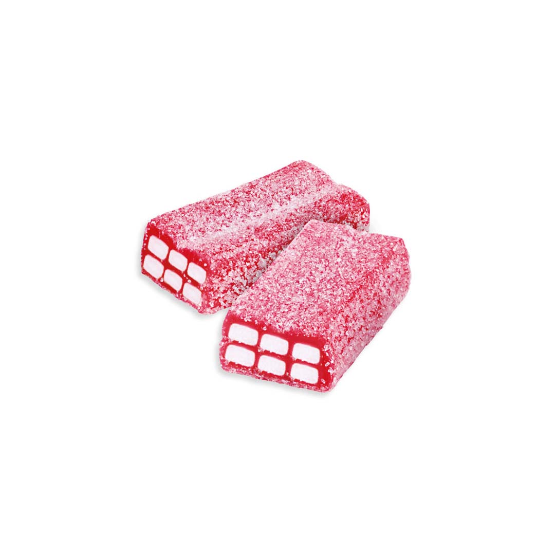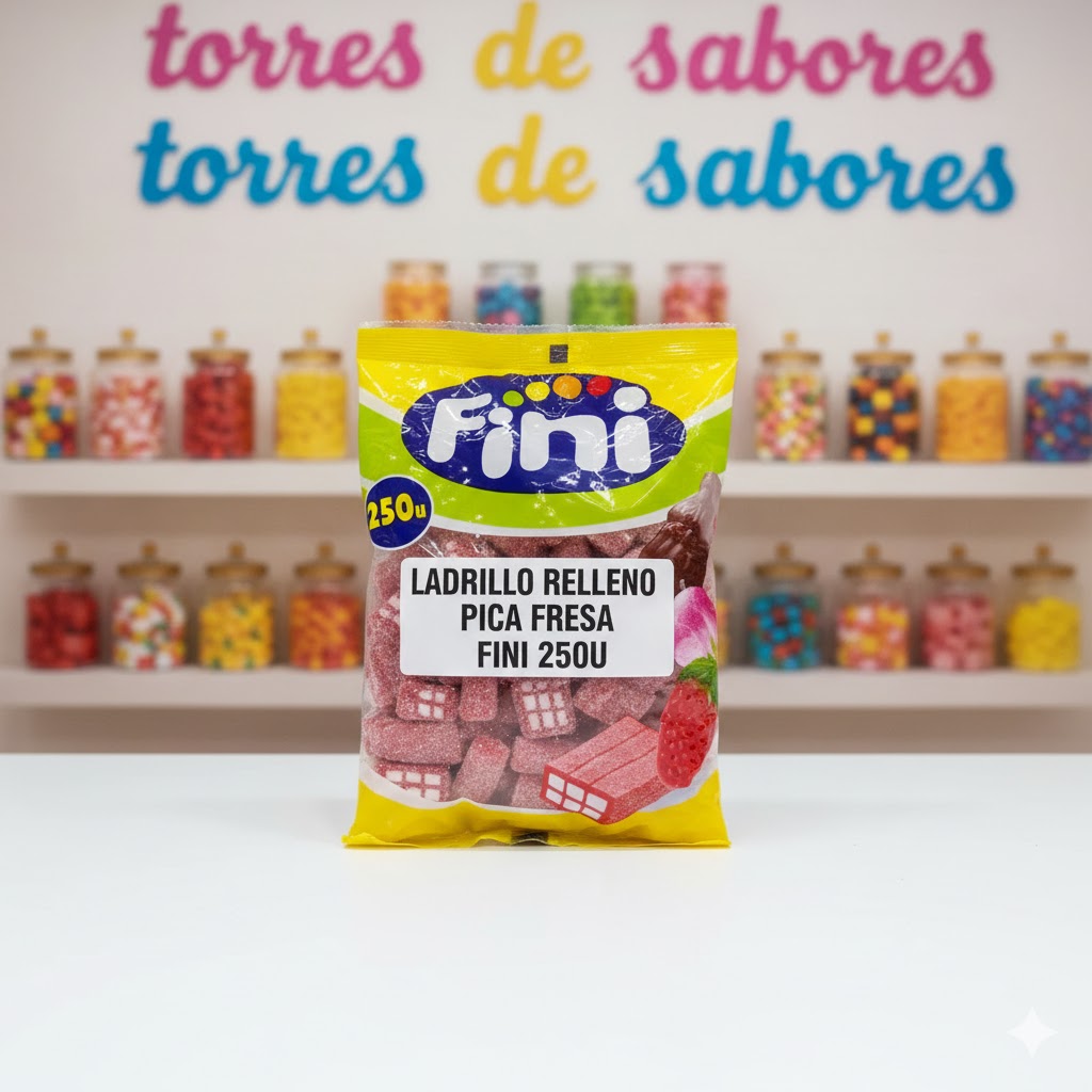 Ladrillos de fresa, rellenos de nata , envuelto en un explosivo sabor a picapica. Muy rico, ácido y sabroso. Se presenta en bolsa de 250 unidades.