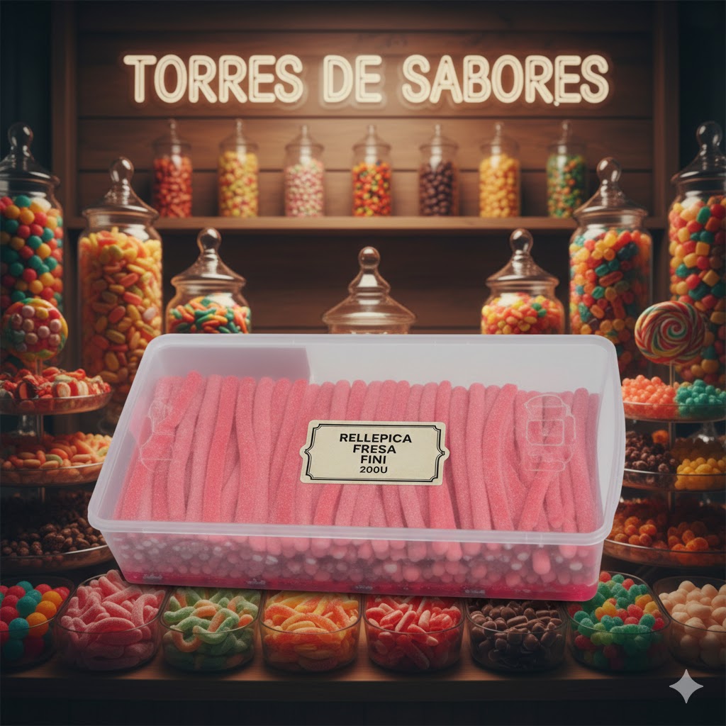 Tarro con 200 unidades de regaliz Rellepica Fini sabor fresa con relleno de nata y cobertura pica-pica. Ideales para candy bar, cumpleaños, eventos o para disfrutar en cualquier fiesta.