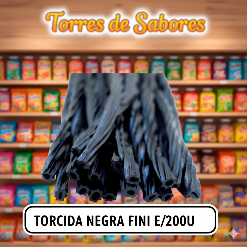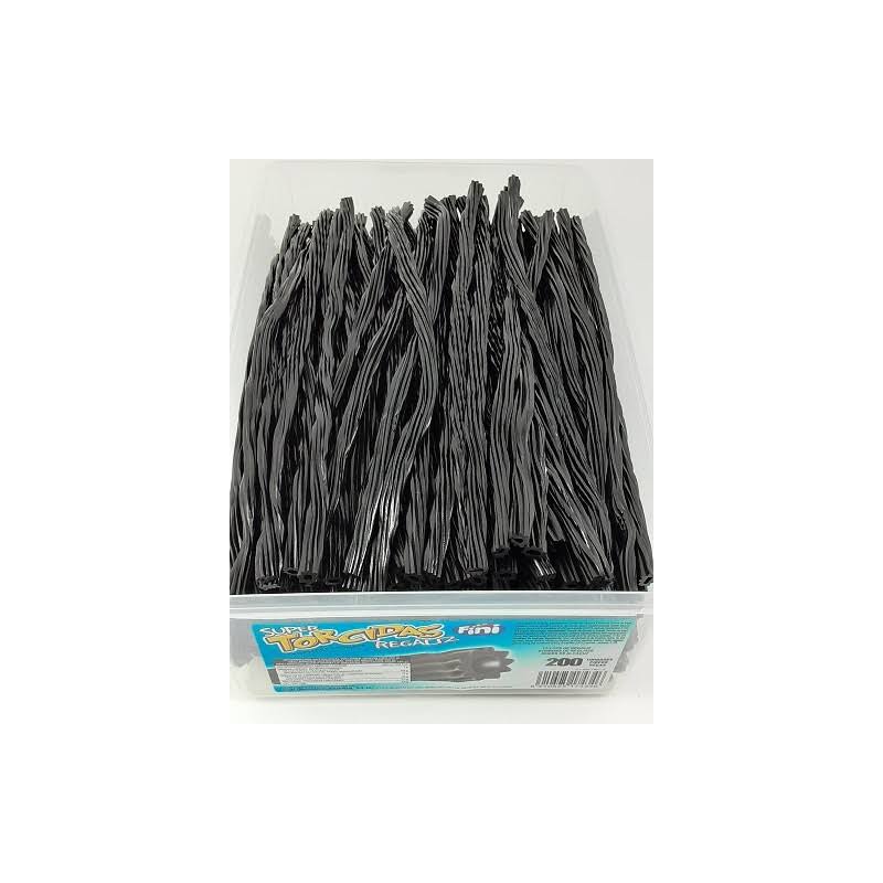 Los regalices o las torcidas son una de las gominolas imprescindibles en cualquier tienda de chuches, por ello, no podía faltarnos. Las regalices torcidas negras son un tipo de dulce tradicional que tiene una textura masticable y un sabor característico que suele ser fuerte y ligeramente amargo. Son populares en muchos países y se caracterizan por su color negro intenso. Aunque las regalices negras son populares en forma de "torcidas" (es decir, con forma de espiral o trenza), también se pueden encontrar en muchas otras formas, como palitos, láminas o incluso rellenas de otros sabores.