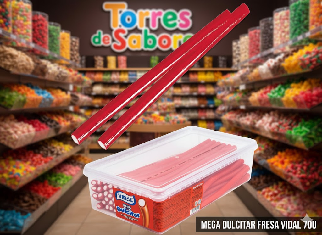 Caja con 70 unidades de regalices mega Dulcitar sabor fresa y grandes, de la marca de golosinas Vidal.