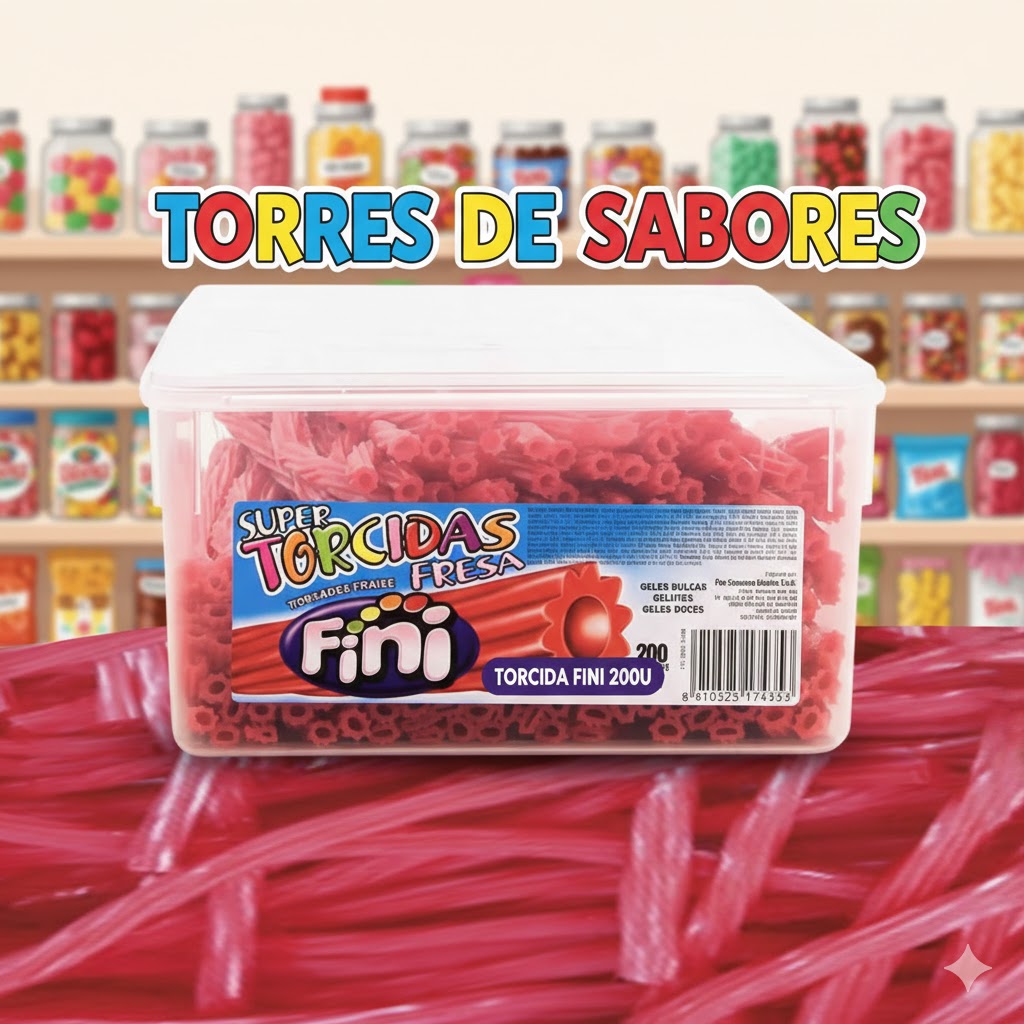 Tarro con 200 unidades de regalices Torcidas Fini rojas con sabor a fresa. Ideales para candy bar, cumpleaños o para disfrutar en cualquier momento.